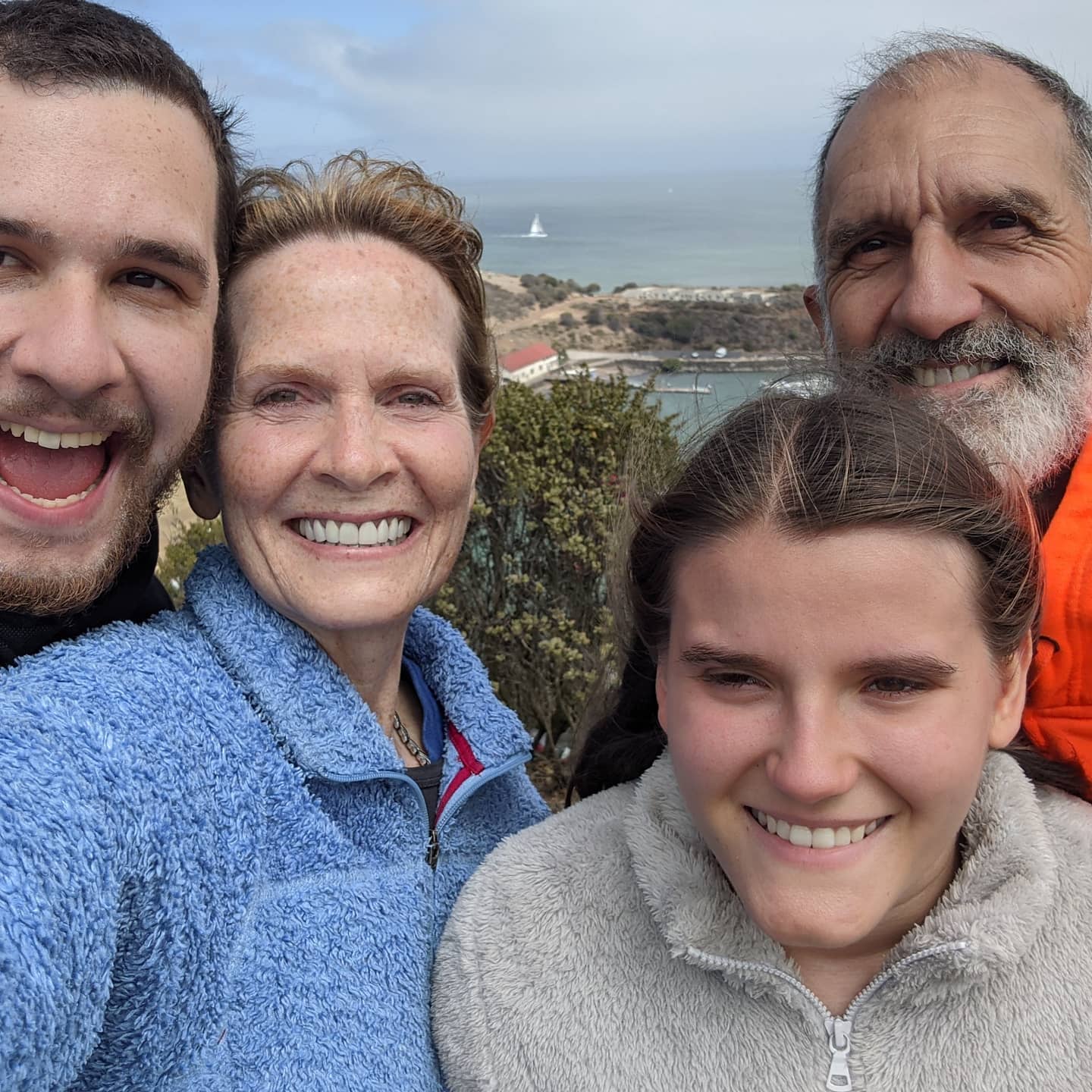 Today we bid farewell to San Francisco and got some parting photos of the Golden Gate Bridge, which was actually visible today. It was cold and windy at the bridge, then it got hot and sunny again as we drove north through beautiful hills and farmland up to the coastal town of Bodega Bay. My deepest gratitude to my sweet brother, Ron, and sister-in-law, Joanne, for finding us a wonderful place to stay in the Bodega Bay RV Park. (Places to camp are not so easy to come by up here). Quiet. Cool. Peaceful. Next to a national forest. Walking distance to the ocean. Never would I have guessed that having a full hook up in our own little home on wheels would feel like such a luxury.
