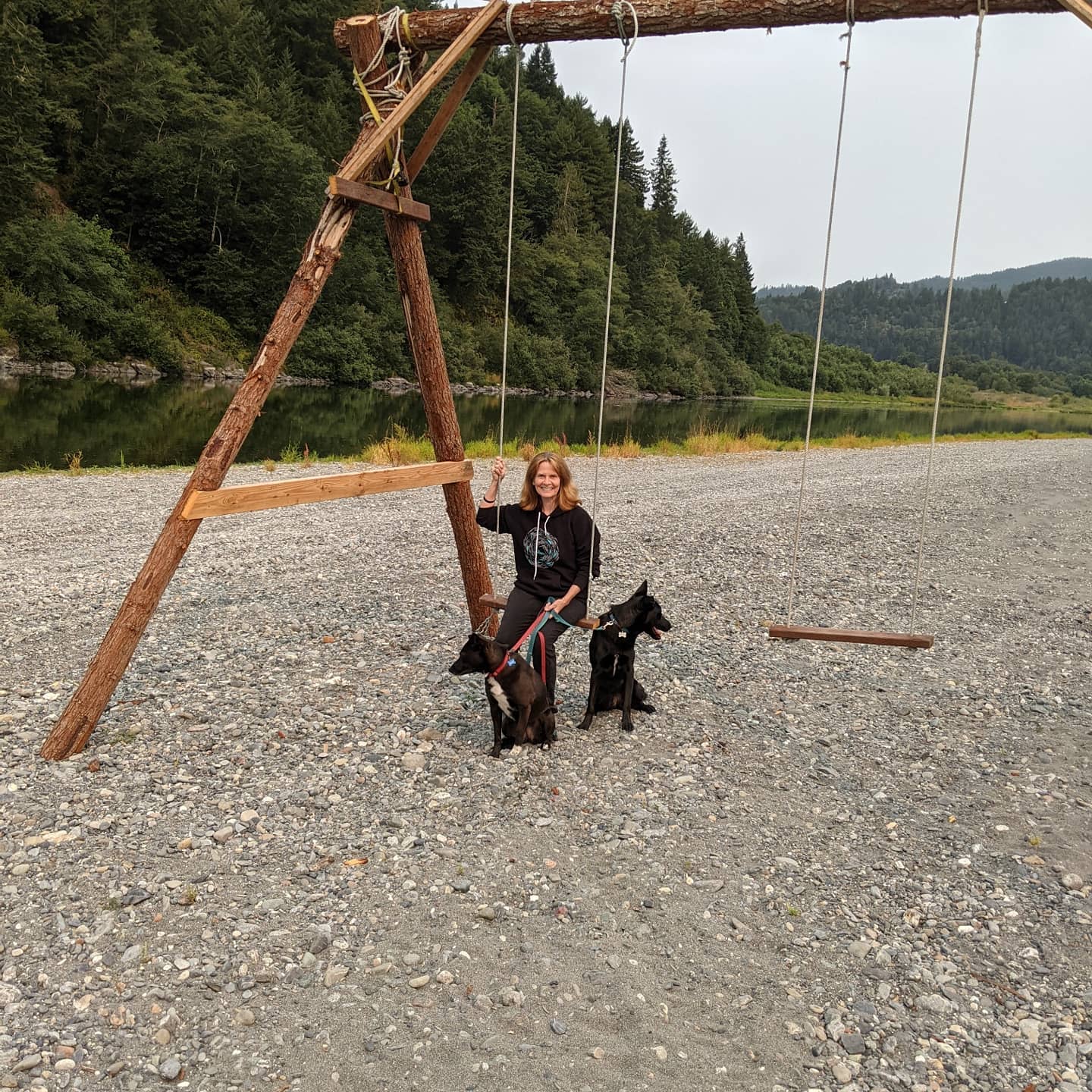 Early Morning Walk with the pups. I was scared to follow the trail into the woods because of bears and elk and my overactive imagination, but Ernie said “let’s go just a little further”. We walked down a wooded trail that opened onto the most beautiful and peaceful river beside a huge opening. No houses. Nothing there but a shack up in the woods and a giant swing set in the middle of nowhere by a river. The dogs went swimming. We were surrounded by beauty. I am discovering that often it is good to push past my imaginary fears to discover the glory that lies just on the other side.