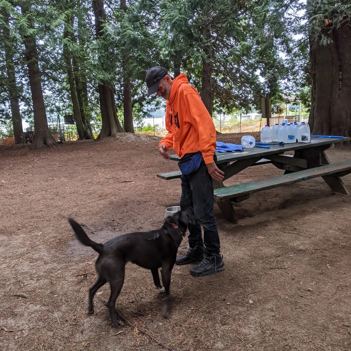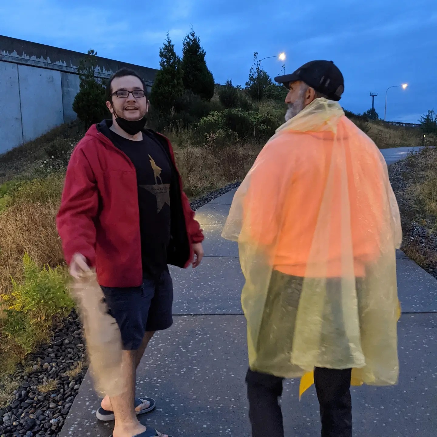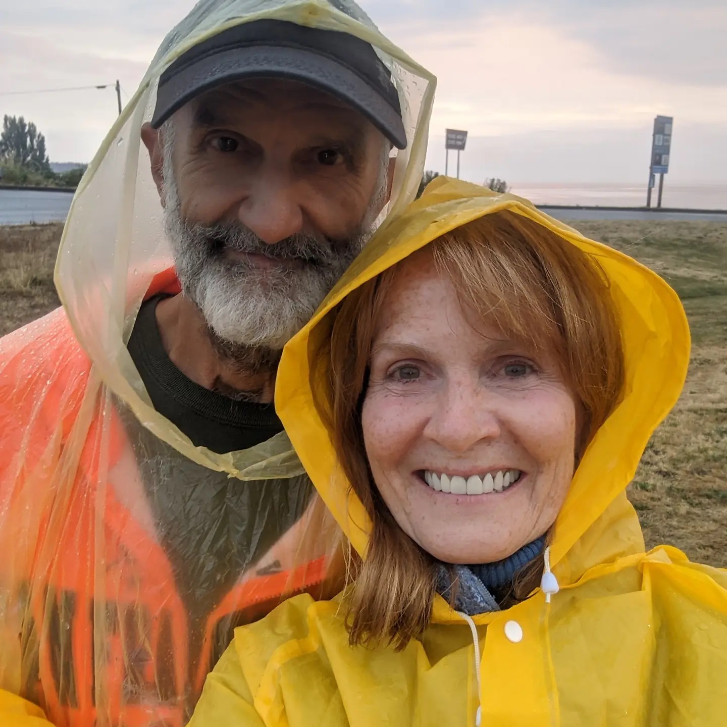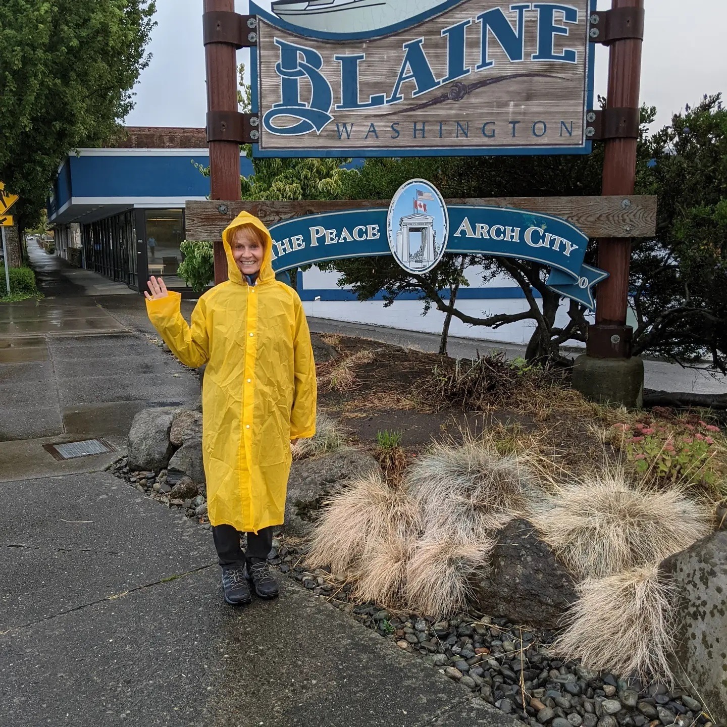 Our first cold and rainy day since the monsoons of Arizona. We had a window of time to play a little soccer with Skylar at the dog park, then waited in the car for Elijah to return from his grand adventure in Canada. When it was time for Eli to cross back over, Ernie and I walked up and stood in bright yellow rain gear at the border to welcome our ecstatically happy son back with open arms. Before Elijah came through, the border guard watching us came out several times to say that we could just tell Eli to follow the sidewalk to Blaine, and then to suggest that maybe we were waiting at the wrong crossing altogether. We thought he might be trying to get rid of us because Ernie was showing me a tap dance at one point, and the guard didn’t want us to confuse and dumbfound the passenger cars passing through. One elderly gentleman pulled up in his truck, thought we were somehow part of the border guard and said “Boy, things sure have changed since I was last here!”