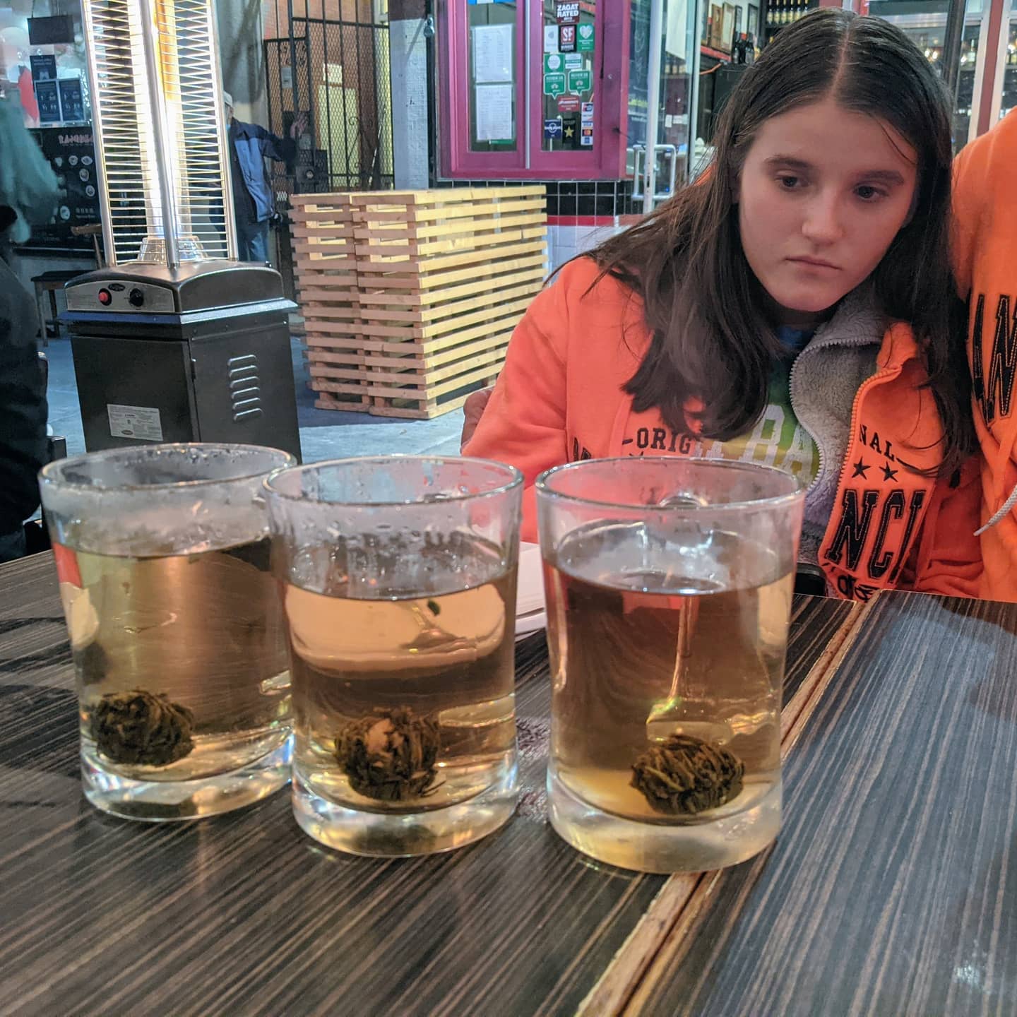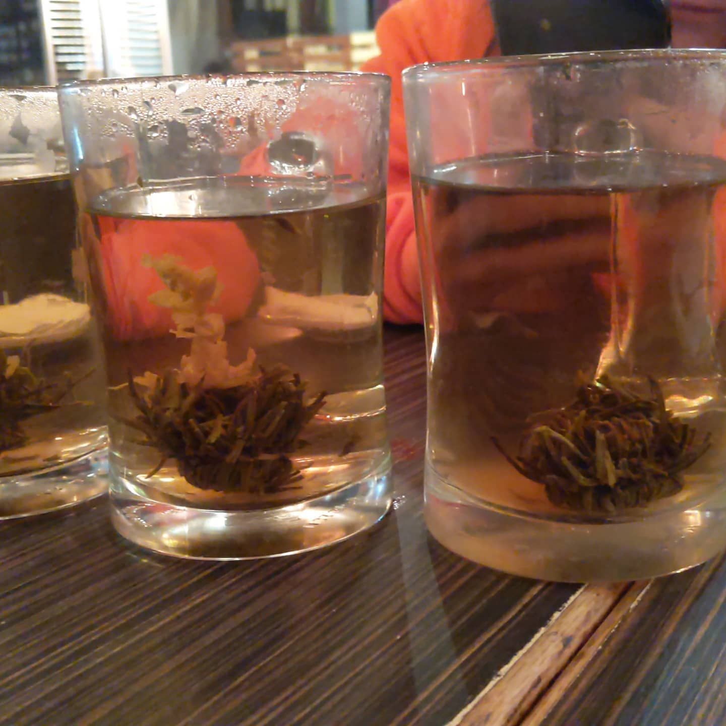 Yesterday (Sunday) we went in to see the sights in San Francisco wearing our shorts and t-shirts to find people walking around in jackets, long pants, and warm hats. What!?! The fog rolled in and it was 61 degrees! After buying sweatpants and sweaters, we toured The Presidio, took photos on the beach in front of the Golden Gate Bridge hidden in the fog, walked around Fisherman’s Wharf, and had the best Chinese food we’ve ever had. The owner came over and said “I am a chef, let me order for you. I know what you will love. You don’t have to think”. We turned it over to him and he was right. It was amazing. We had blossom tea and watched as these tea buds blossomed into flowers in the glass. It was a magical night.